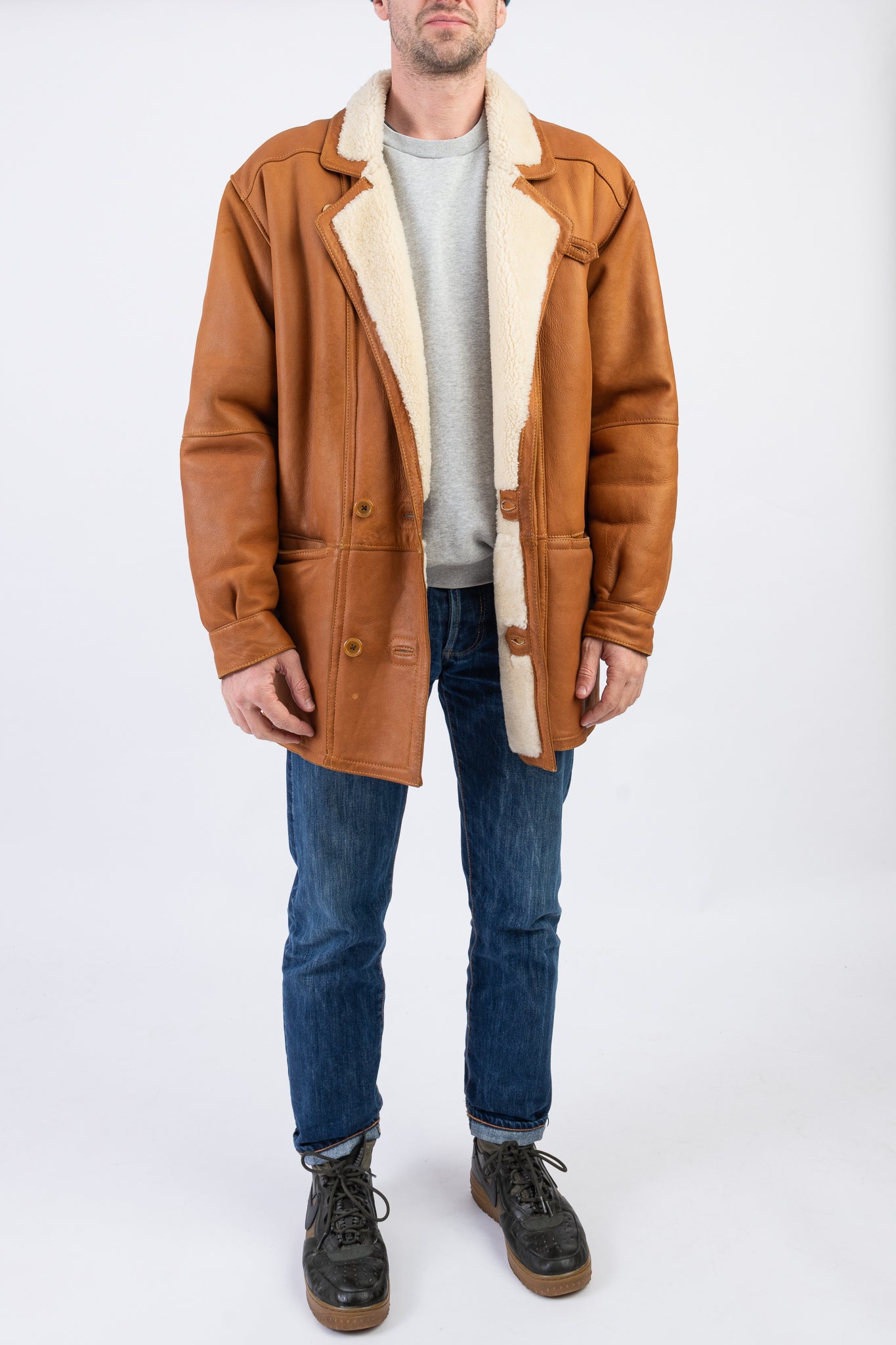 FEATURES: double-breasted 2 button fastening, notched collar with 1 button fastening near neck, 1 zip fastening chest pocket, 2 pockets at the waist, snap fastening at cuffs. Were this chunky supple leather shearling with the sleeves as is, or turn up the cuffs to show the fluffy fur!